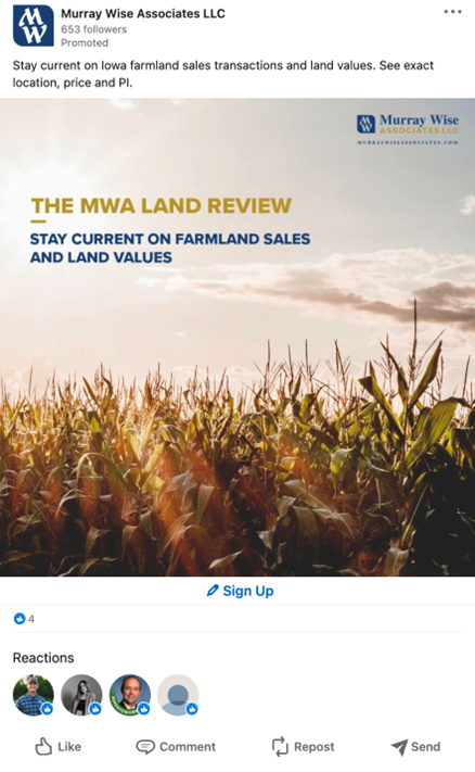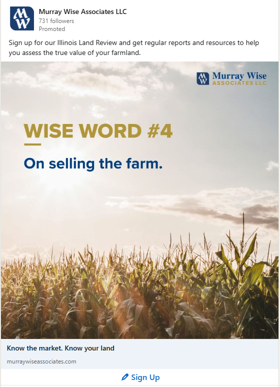 To connect with trust attorneys and wealth managers, we encouraged MWA to use their land values report as a lead generation tactic. To promote sign-up, we built a LinkedIn plan that follows the release of the bi-monthly report and has driven nearly 1,000 highly engaged prospects to the Murray Wise website. This helped MWA stretch their ad dollars and created a way to stay in front of an important audience over time.